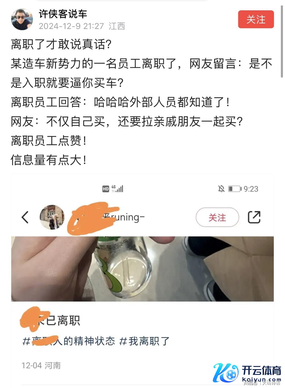 近日有汽车博主发帖称,下野了才敢说实话?某造车新势力的又名职工下野了,网友留言:是不是入职就要逼你买车?下野职工回答:哈哈哈外部东说念主员皆知说念了!网友:不仅我方买,还要拉亲戚一又友沿途买?