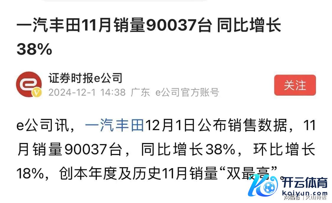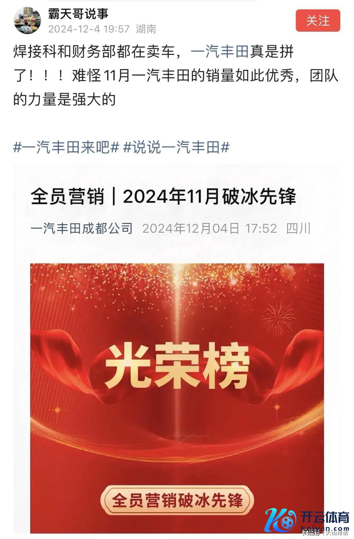 12月4日,一汽丰田成皆公司在其官方公众号发布讯息,全员营销2024年11月破冰前锋。