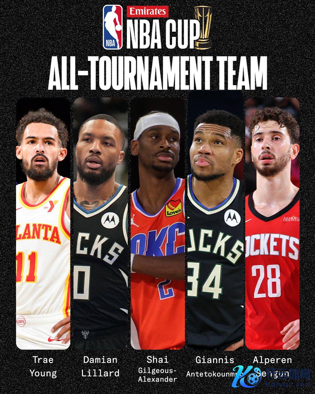 直播吧12月20日讯 NBA官方公布了本届NBA杯的最好气势:字母哥、亚历山大、、申京和特雷-杨开云(中国)kaiyun网页版登录入口。