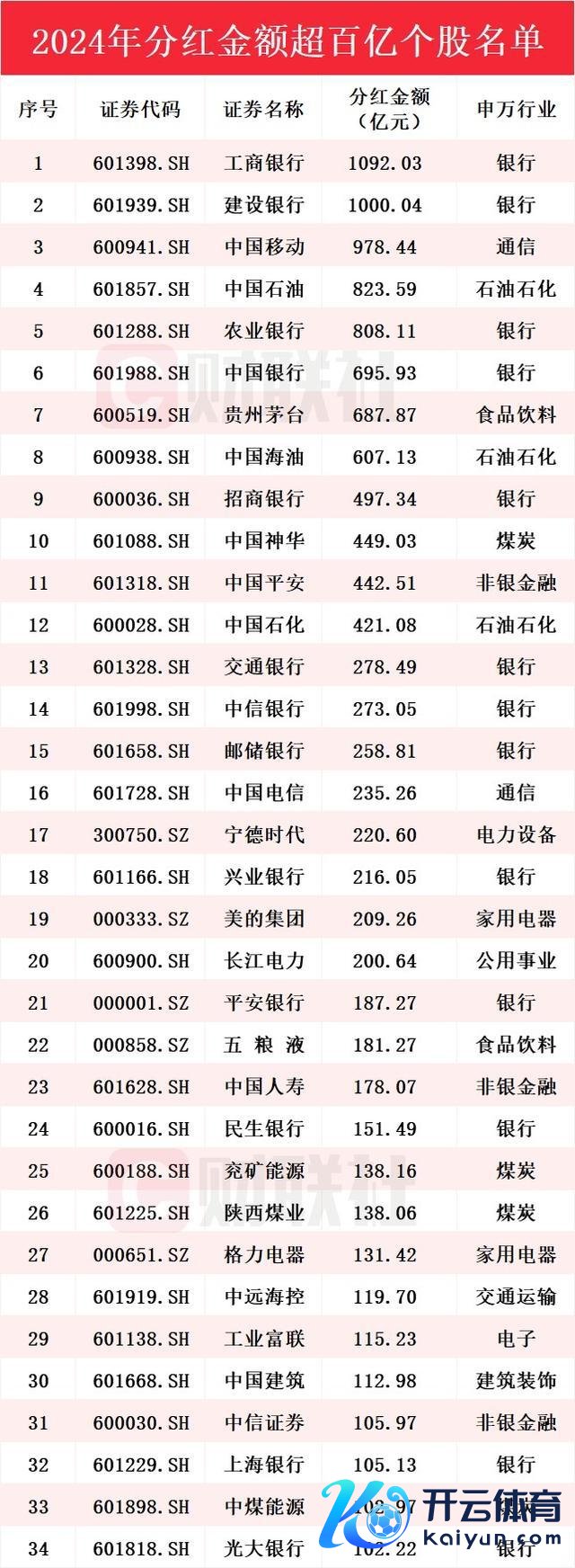 12 月 31 日,Choice 数据贯通,汗漫发稿,本年已有 3973 家上市公司实行了现款分成,现款分成金额共计 2.4 万亿元。从上市公司分成金额来看,年内共有 34 股分成超百亿。 其中,工商银活动年内分成金额最高个股,为 1092.03 亿元,成立银行紧随自后,分成金额为 1000.04 亿元。 中国迁徙排在第三位,分成金额为 978.44 亿元。 中国石油、农业银行分成金额均超八百亿,位列第四、第五。 中国银行和贵州茅台分成金额隔离为 695.93 亿元、687.87 亿元,位列第