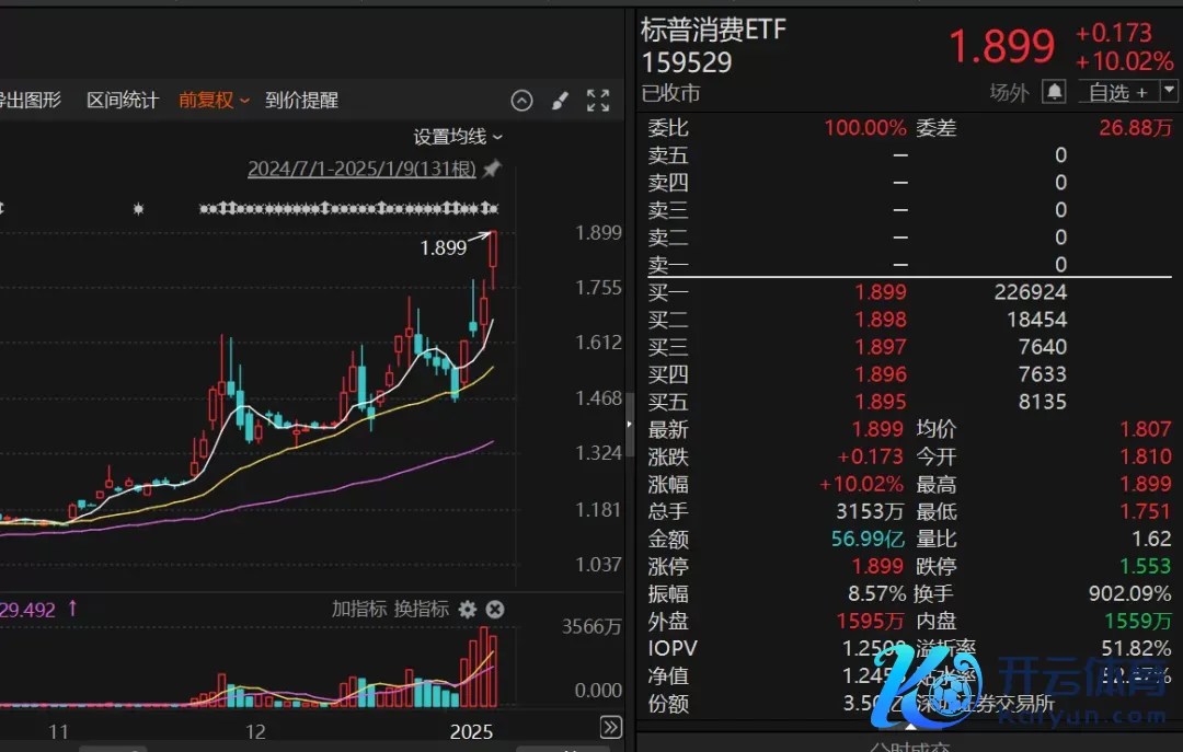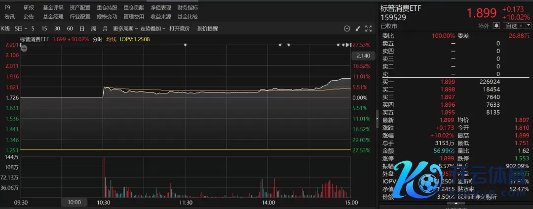 相同涨停的还有景顺长城标普挥霍ETF。该ETF在昨日10倍换手率之后,当天依然持续强势,换手率为902.09%,成交56.99亿元。