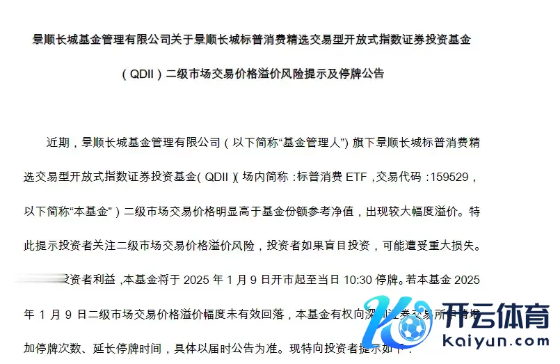 当天晚间,景顺长城基金处置有限公司发布公告称,标普挥霍ETF二级市集交往价钱彰着高于基金份额参考净值,出现较大幅度溢价,将于2025年1月10日开市起停牌,复牌时期另行公告。