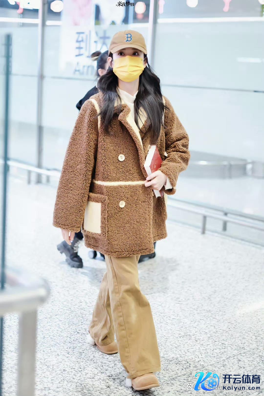张婧仪关于驼色系的青睐在这套棕色翻领外相一体外衣中得到了完好展现。内搭白色高领衫,下半身搭配卡其色直筒裤,举座色融合谐而温暖。脚踩棕色毛毛遮拦拖鞋,头戴卡其色棒球帽,既温暖又帅气,展现了张婧仪多变的前卫气魄。