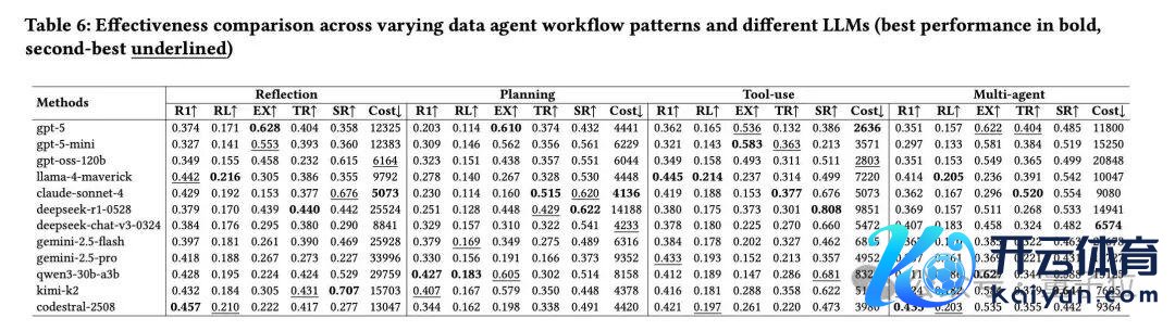 架构复杂度量度复杂Data Agent架构(如Multi-Agent、Reflection)在异构数据分析准确性上显耀优于浮浅架构,但代价是计划本钱成倍增多(6-20倍资源滥用),浮浅架构如Planning则在后果上占优但濒临复杂问题适合性有限;计划资源重分派效应不雅察到不同Data Agent架构骨子是通过从头分派计划支出完好意思优化——Reflection架构将26-29%计划用于重试机制相易高质地输出,Planning架构将32-35%用于生成阶段保证后果,这种“判辨负载重分派”为阐明任务场景选择合适架构提供了量化指点模子-架构适配性大界限Agenic Data下预锻练的模子即使是Non-Thinking Model(如Kimi-k2)在复杂Multi-Agent和Reflection架构下依旧进展超过,一些Thinking Model(如DeepSeek-R1)在复杂Data Agent架构中反而出现“双重推理刑事包袱”表象,这标明模子选择需要匹配架构复杂度。