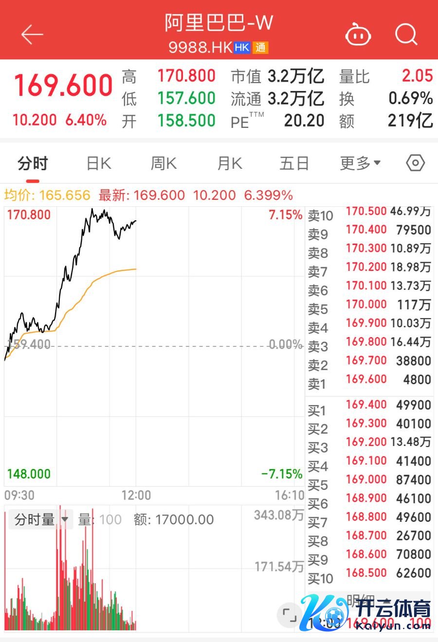 9月24日,阿里巴巴(9988.HK)港股迎来强势爆发,盘中股价一度飙涨超7%。驱逐午间收盘,阿里巴巴港股报169.6港元/股,涨幅为6.4%,创下2021年10月以来新高,总市值来到3.2万亿港元。
